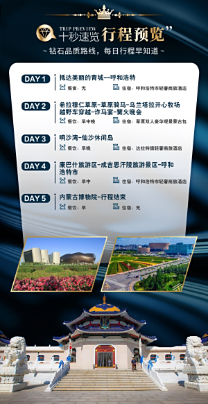 D4 | 早餐后 乘车赴三季有花,四季有绿,水在城中,城在草原上的AAAA级旅游城市【康巴什】,城中是蒙古文化的建筑物和城市雕塑,它是鄂尔多斯现代化中心城市的核心区、环境艺术示范城市。康巴什以“草原上升起不落的太阳”为设计理念,开启了新的旅游模式,城市就是景区,景区即为城市。 中餐之后乘车前往国家AAAAA级旅游景区—【成吉思汗陵旅游景区】,是蒙古族民众朝觐的精神圣殿,是蒙古帝国第一代大汗——成吉思汗的衣冠冢;它不仅是历史的见证,更是文化的瑰宝,在这里探索历史的宝藏,感受帝王的气息。一代天骄成吉思汗,横跨欧亚最终在这里落幕,他是传奇领袖的永恒纪念。 后乘车返回呼和浩特市,入住酒店休息。 【暖心提示】: 1、今日车程时间较长,如有晕车,自备药物并且请按需自备补给,确保旅途舒适愉快; 2、成吉思汗陵属于政府性接待景区,景区内游客需自由参观,无导游讲解; 用餐:早中 住宿:呼和浩特市轻奢商旅酒店 |
