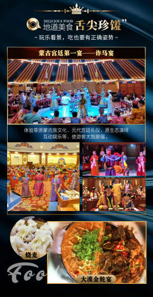 D2 | 早餐后乘车赴“敖包相会”的五彩天地——【希拉穆仁草原】,横穿农耕文化和草原文化的天然分界线,历代兵家必争之地——阴山山脉,途径“帝网之乡、北魏重镇武川县”。 抵达草原后,接受蒙古族最高贵宾仪式—敬献下马酒!穿着蒙古族服饰的小伙、姑娘为您歌唱、敬酒,洗去一路风尘,一饮下马酒,豪气顿生情万丈。呼吸着新鲜的空气,享受着阳光的沐浴,远离尘嚣,融入大草原的怀抱。 后参加草原骑马(已含护具保险)策马扬鞭,呼啸无疆四野。 餐后安排游览“离天空最近的地方”——【乌兰塔拉开心牧场】 【草原极速轨道滑草】坐在滑车上沿轨道从高处快速滑下,感受风驰电掣的刺激和草原美景,借助草原的自然坡度,给您带来强烈的速度体验和刺激感; 【草原卡丁小火车】行驶在草原轨道上,能让游客近距离欣赏草原的壮美景色,感受童趣的快乐; 【火山蹦极】草原上的火山蹦床以其独特的设计,在草原上让您寻求新鲜刺激,尽情释放压力,让您体验草原的欢乐时光; 【体验蒙古族传统项目】射箭、搭建蒙古包、打沙包、赛布鲁,玩蒙古象棋、捡牛粪、蒙古袍照相、学蒙古语、蒙古文字、蒙古歌、挤牛奶、放羊、放牛、马、骆驼、捡牛粪勾起您关于青葱岁月的共鸣,分享未曾磨灭的童年记忆; 【草原萌宠神兽】草原神兽--草泥马,摸摸头、合张影;土拨鼠、白狐、温驯的小矮马,最适合小朋友近距离接触,两个小短腿走进草原的背影,简直萌化了心;还有我们温和柔顺的萌萌兔……草原动物园,是否给了你别样的惊喜? 【红色记忆纪念馆】宝力格人民公社大食堂、观看忠字舞演绎、入党宣誓......回顾这片热土上的那些红色印记;抗战时期的百灵庙大捷;大饥荒时代的三千孤儿;六十年代的草原英雄小姐妹,深度体会草原博大胸怀,让那些感同身受的人们重温那一段激情燃烧的岁月。 【网红桥】在动感音乐的伴奏下,三五成群走上吊桥,晃悠悠,荡悠悠,虽然不时有人掉下去但还是喜笑颜开,其乐融融,光彩夺目的网红桥,点亮了草原之夜,点亮了蒙古族人民的热情。 【彩色越野车激情穿越草原腹地15公里】(不含操场维护费保险需现交车队60元/人),沿途可体验,网红火山打卡拍照,高山大秋千的刺激,与草原网红稻草人合影,这是一场将速度激情与草原风光深度融合的特色体验,带您解锁草原鲜为人知的魅力。 【晚餐享用元代皇家贵族盛宴—诈马宴】参加宴席者都将更换为统一蒙古族服饰入席就坐,饮一口马奶酒,品淡淡的奶香,赴一次皇家盛宴,做一次王爷王妃,体验草原蒙古族文化、元代宫廷礼仪、原生态演绎、互动娱乐等,使游客大饱眼福。 晚餐后参加民族篝火互动晚会,随着火苗的舞动,草原儿女携远方的宾客载歌载舞欢声笑语,嗨翻草原夜幕。篝火向星辰,所愿皆所成。 【暖心提示】: 1、草原宫廷盛宴——诈马宴以民族歌舞表演为主,餐食属于赠送; 2、草原蒙古包住宿条件有限,主要以体验为主,不能与酒店比较,热水为太阳能热水器供应,受天气影响,有时无法洗澡,敬请谅解; 3、在草原上骑马要在指定范围内活动,以免迷失方向或破坏草场(草场牧民私有制),如马倌推荐跑马,属客人自愿行为,产生费用和人身安全自行承担责任; 4、手把肉为特色餐,品尝量少,如客人喜欢可在餐厅单点; 5、草原气候多变,篝火晚会若因天气原因无法正常安排,费用不退。 用餐:早中晚 住宿:草原豪华观景蒙古包(不提供一次性洗漱用品,请自备) |
