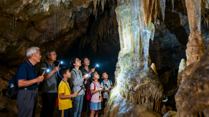 依托织金洞、龙宫等场景,打造主题式实景剧本游。“溶洞探秘・地质密码” 线路以织金洞为舞台,设计融合钟乳石识别、地下河溯源、地质谜题破解的任务,青少年在互动中深化喀斯特地质知识;“龙宫寻踪・非遗线索” 剧本游则结合溶洞景观与民族文化,通过破解蜡染纹样、银饰符号谜题,解锁民族非遗的文化内涵。